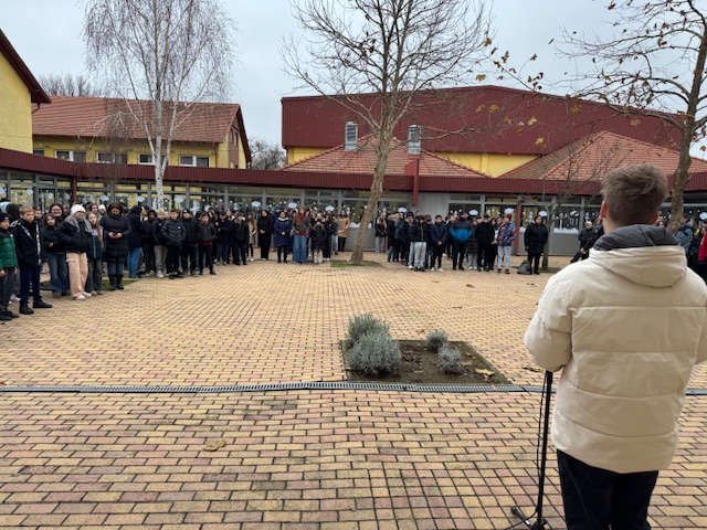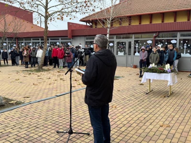 A felső tagozat díszudvarán diákok és pedagógusok gyűltek össze, hogy együtt vegyenek részt az adventi iskolai ünnepségen, amelynek középpontjában a harmadik gyertya meggyújtása állt.