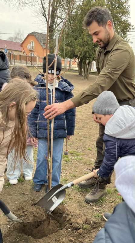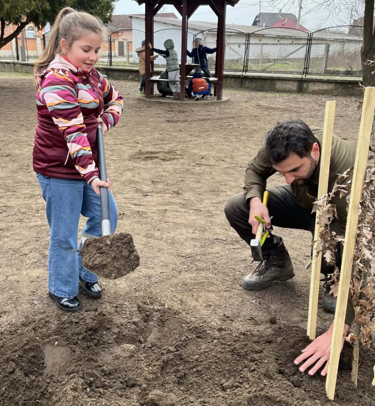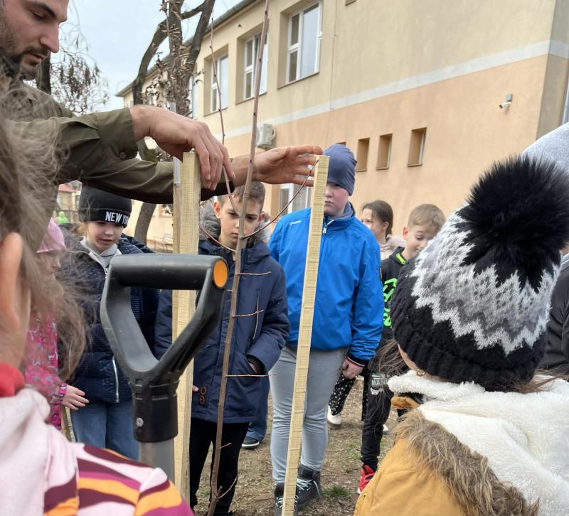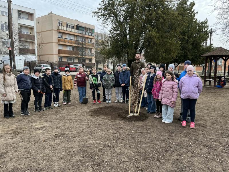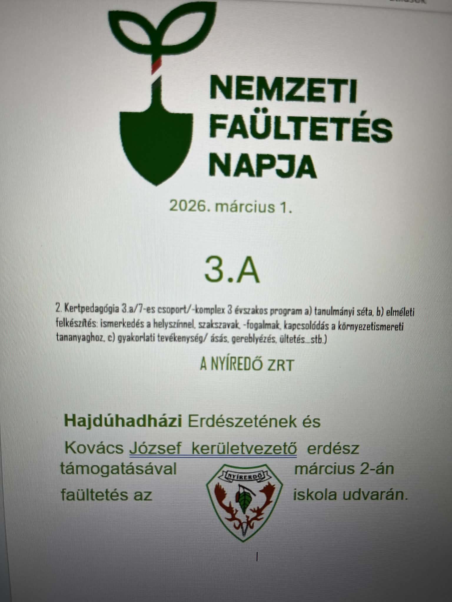A NYÍREDŐ ZRT Hajdúhadházi Erdészetének és Kovács József kerületvezető erdész támogatásával március 2-án faültetés az iskola udvarán.