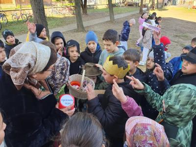 Az előzetes feladatnak megfelelően a gyerekek népmesehősnek öltözve válaszolhattak a szünetekben a mesével kapcsolatos kérdésekre. A helyes válaszokért apró ajándékot kaptak.