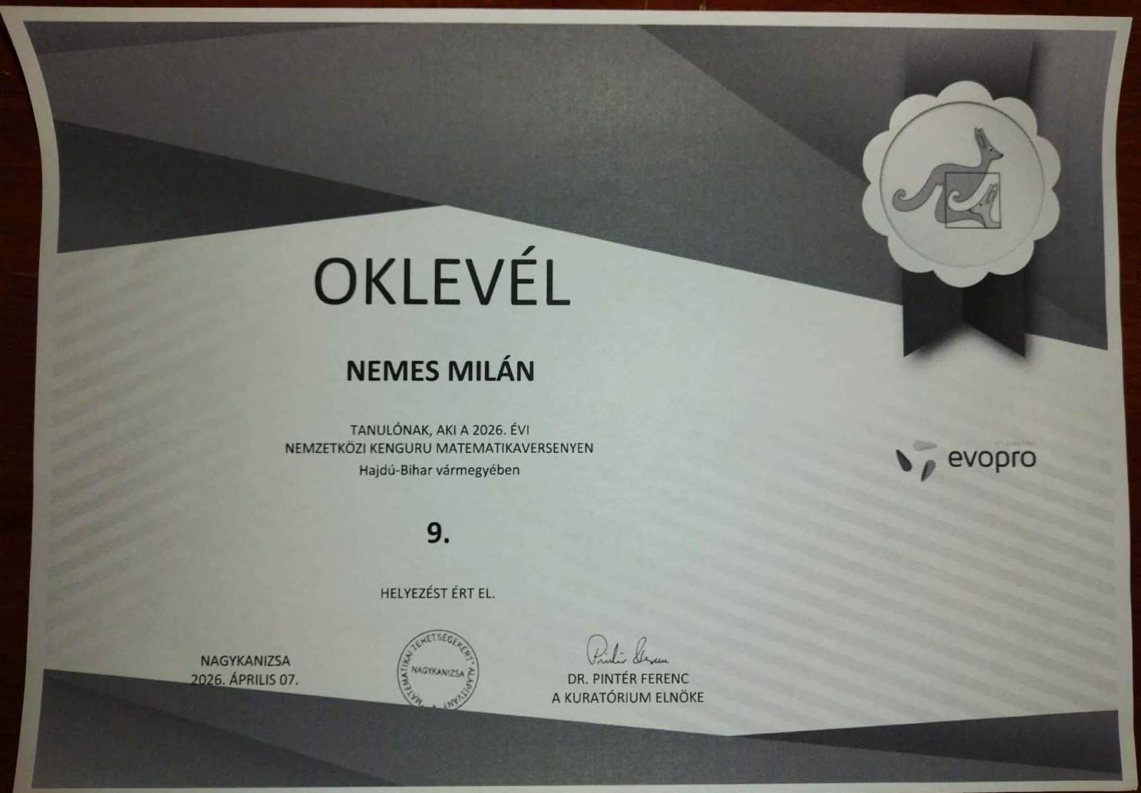 9. Nemes Milán 3.a osztályos tanuló,