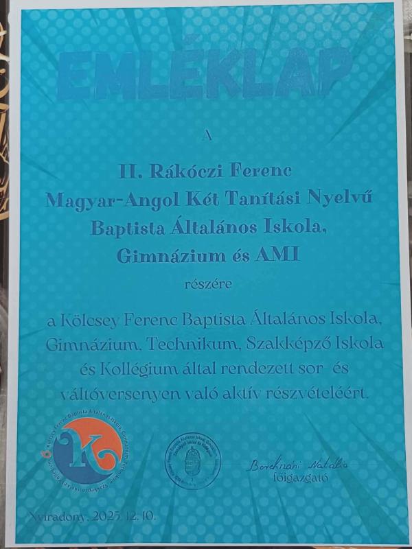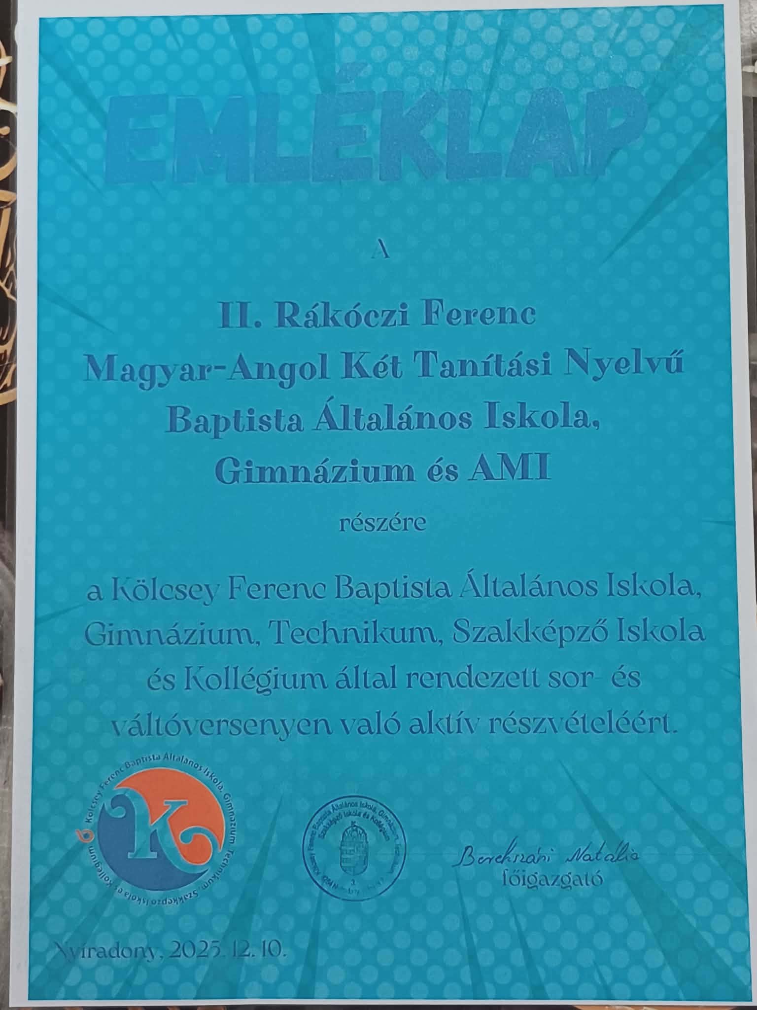 2025.December 10-én került megrendezésre a Kölcsey Ferenc Baptista Általános Iskola, Gimnázium, Technikum, Szakképző Iskola és Kollégium által szervezett Kölcsey sor-és váltóverseny a nyíradonyi Harangi Imre sportcsarnokban.
