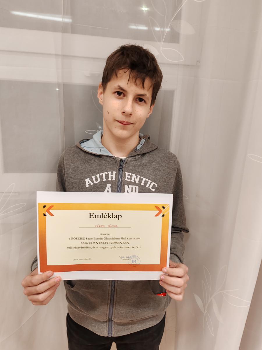 2025.11.10 -én Újfehértón a KOSZISZ Szent István Gimnázium által szervezett Magyar Nyelvi Versenyen iskolánkat Váradi Sándor 8.c osztályos tanuló képviselte. A versenyen való részvételéért, és a magyar nyelv iránti szeretetéért Emléklapban részesült.